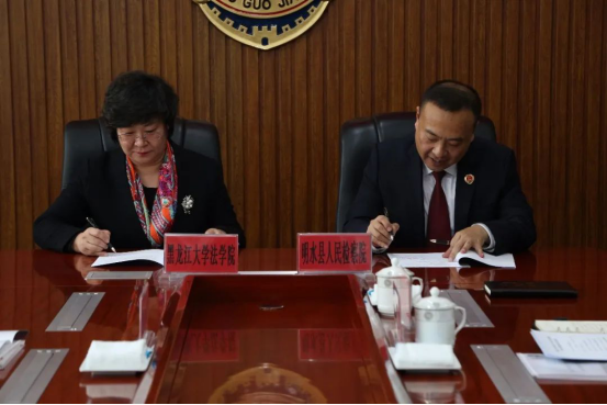 院长哈书菊与明水检察院党组书记、检察长王焱共同签署《检校共建协议书》。