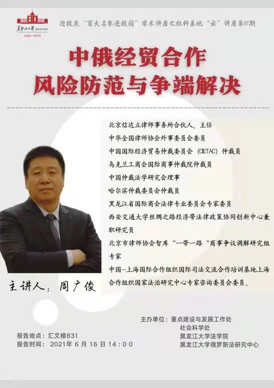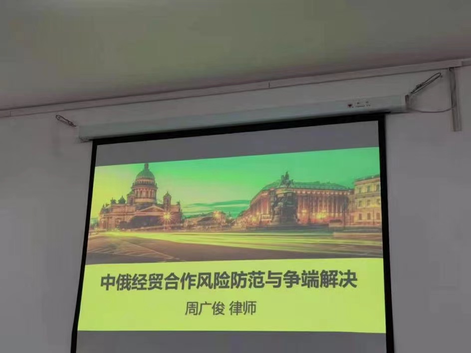 汇文楼835室举行。此次讲座的主讲人是北京信达立律师事务所合伙人、主任周广俊律师,主题为“中俄经贸合作风险防范与争端解决”。讲座由黑大乐鱼