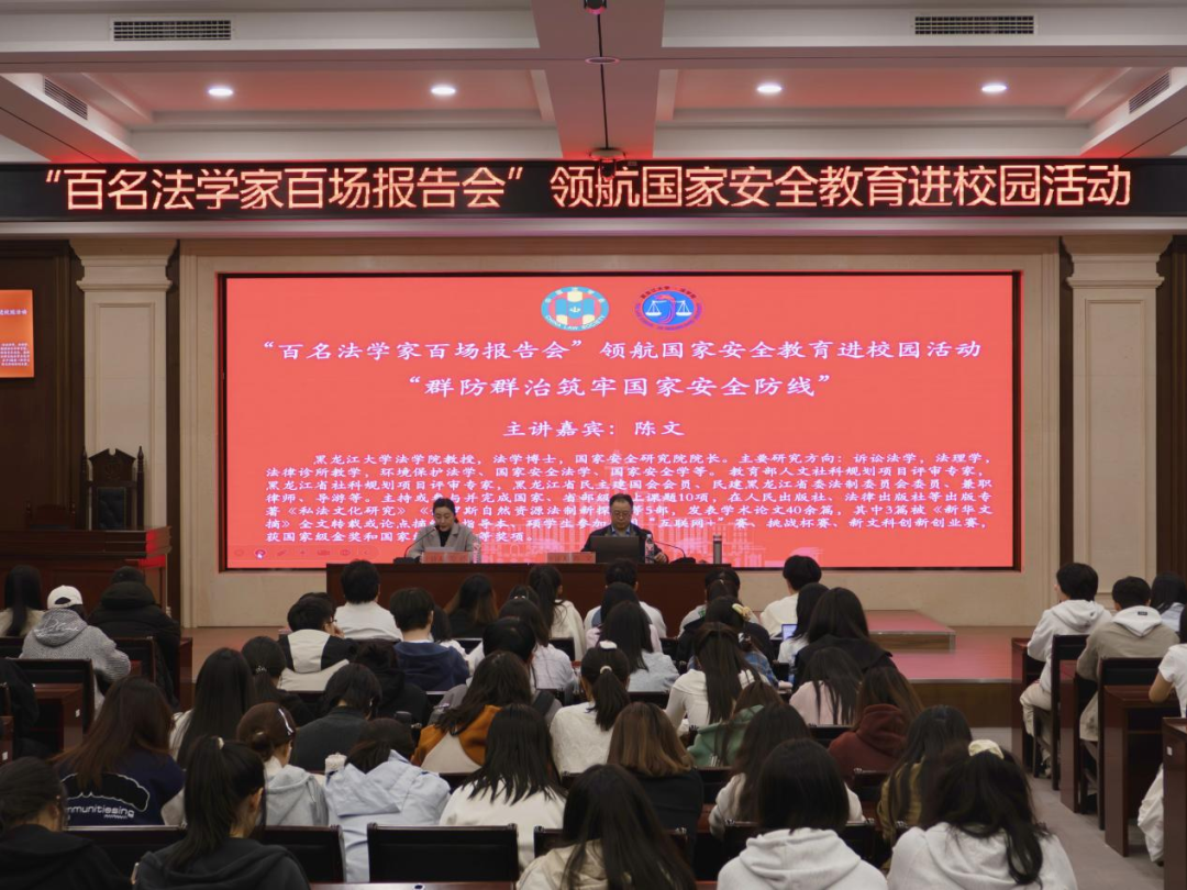 教授、法学博士、国家安全研究院院长陈文作为主讲嘉宾以“群防群治筑牢国家安全防线”为题,为师生带来一节内容丰富、思想深刻的国家安全讲座。本次讲座由黑龙江省法学会学术交流部三级调研员关冰主持,乐鱼