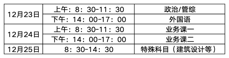 每科考试时间一般为3小时;建筑设计等安排在12月25日考试的特殊科目考试时间最长不超过6小时。详细考试时间、考试科目及有关要求等由考点和招生单位予以公布。
