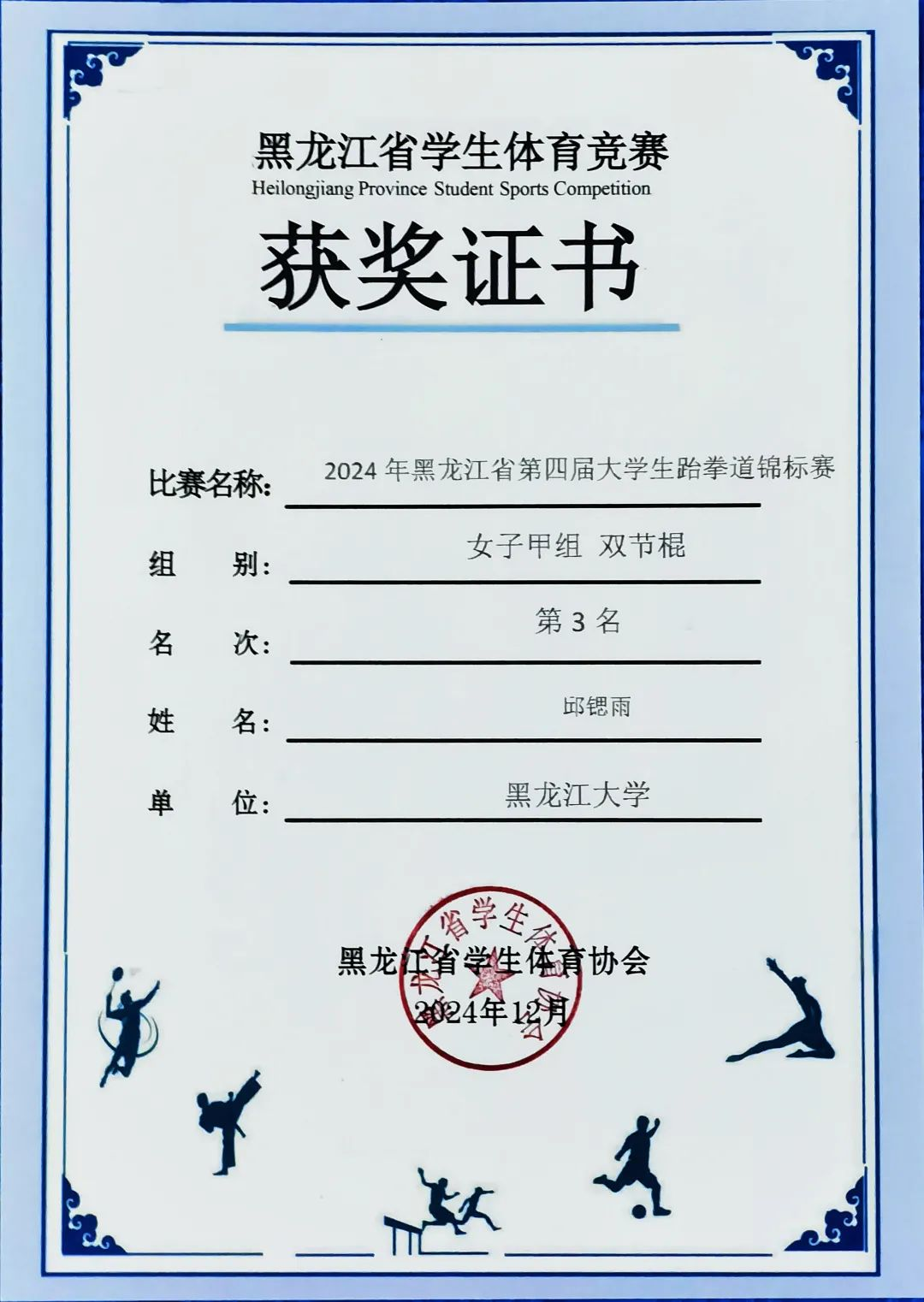 邱锶雨同学精神抖擞,斗志昂扬,游刃有余,无论是招式的流畅变换,还是迅速的转身踢腿,都凝聚着平时训练的汗水和心血,也是她对跆拳道这项运动热爱与坚持的最好证明。经过多轮比拼,她获得了黑龙江省大学生跆拳道锦标赛双截棍项目女子组季军,这是她继获得乐鱼