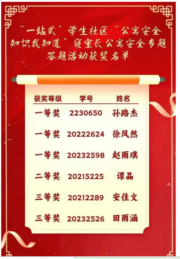 工作实际,广泛动员同学们以寝室为单位参与答题活动,全面覆盖2022、2023级本科、研究生共304间寝室,获得一等奖3名,二等奖1名,三等奖2名的好成绩。
