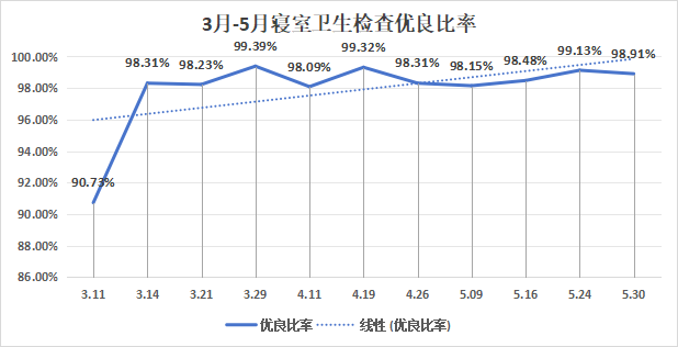 寝室卫生整体向好,逐步探索形成了学生寝室卫生、文明教育和管理的长效机制。