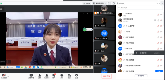 李曼带领学生深入了解检察机关工作的具体情况,主要向同学们介绍国家检察院级别分布情况,检察院内部的机构设置与人员分布,检察机关工作人员的总体工作概况以及其负责的具体部分和对专业检察机关工作人员的能力要求、穿着要求等内容。在李曼分享后,同学们对检察机关工作人员的工作环境、工作日常以及对从事法律工作者的具体要求等都有了更为深刻的认识,对自己人生目标的选择也更为坚定。