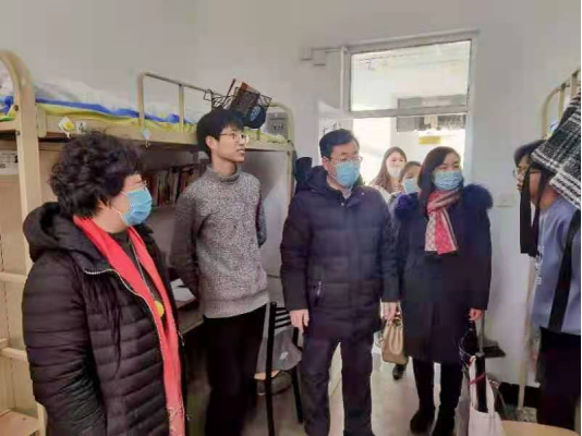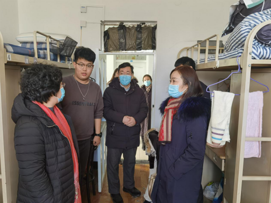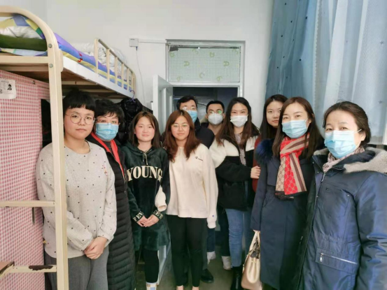 院长哈书菊、党委副书记副院长魏双、副院长丁玉翠、副院长李岩松和全体辅导员老师来到C区13栋、24栋,看望返校同学,并与同学们进行亲切的交流。