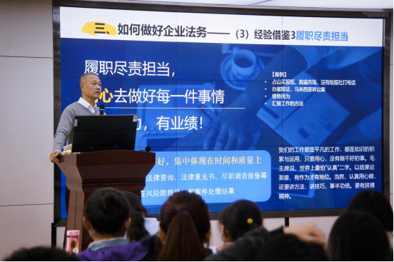 会议伊始,吉利集团副董事长孙宏先生就企业法务这一岗位的机遇与未来向同学们做了充分的介绍。他用实际的案例详细地讲述了法务部在吉利集团的主要职能、工作内容和取得的成绩,并表示企业法务的定位是要聚焦商业成功,规避商业风险,通过各层级法务的密切配合打造一个事前预防、事中控制和事后反馈的工作链条,以此促进企业健康发展。他强调,吉利集团拥有丰富的就业岗位,业务范围遍及全球,吉利一直在创新发展,呼唤更多年轻力量的注入,对此集团特地打造了全方位人才战略方案,让员工进行人才赋能和人才体验,不断加强人才培养,发展赋能通道,实行多岗位轮转,实现价值的最大化。