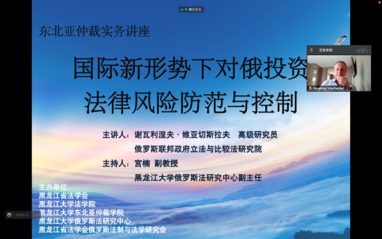 俄罗斯法研究中心、黑龙江省法学会俄罗斯法制与法学研究会共同举办了“东北亚仲裁实务”线上讲座,邀请俄罗斯联邦政府立法与比较法研究院高级研究员谢瓦利涅夫·维亚切斯拉夫作了题为“国际新形势下对俄投资法律风险防范与控制”的专题讲座。他就美欧制裁下对中国在俄罗斯境内投资的影响,以及由此可能在基础设施建设、农业、金融、资源开发、能源以及产业合作等领域引发的投资法律风险进行了分析探讨,介绍了俄罗斯政府采取的保障投资立法举措,并对中国政府和企业应当采取的应对策略提出了建议,探讨了中俄两国政府在国际新形势下稳定投资环境的国际法律合作机制。全国俄罗斯法研究专家、法律实务工作者、对俄企业法务工作者以及黑大师生共计100余人参加了本次讲座,宫楠老师为讲座提供了同传翻译。