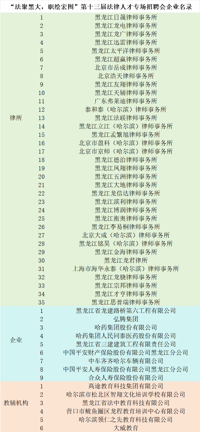 “法聚黑大,职绘宏图”第十三届法律人才专场招聘会将于4月9日(周三)上午9:00—12:00在大学生活动中心四楼建港先锋厅举行。本场招聘会由乐鱼