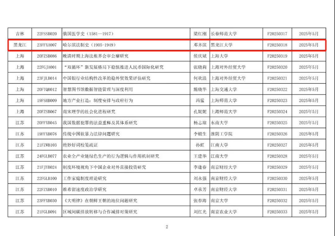 邓齐滨教授主持的国家社科基金后期重点项目“哈尔滨法制史(1905-1949)”(项目批准号:23FFXA007)顺利通过结项鉴定,项目成果《哈尔滨法制史(1905-1949)》已纳入商务印书馆国家社科基金后期资助出版计划。