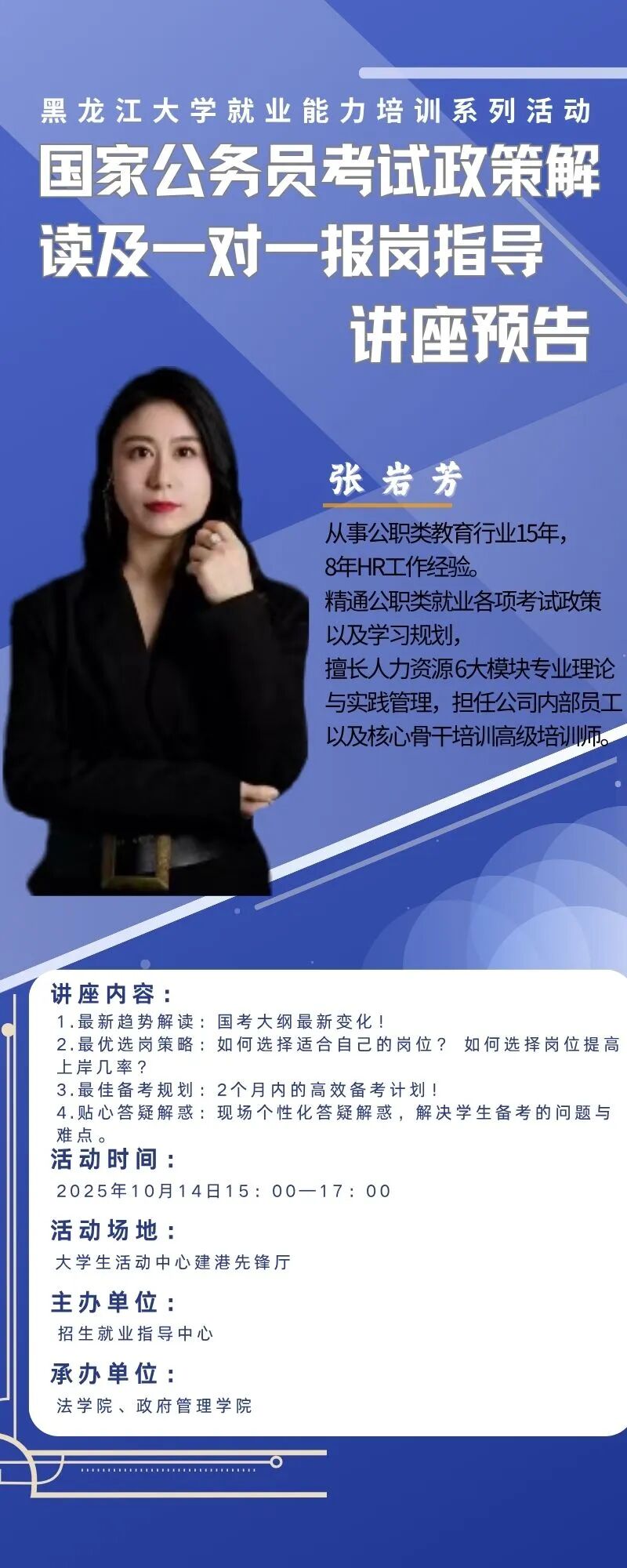 特启动就业能力培训系列活动,本期主题为“公务员考试政策解读及一对一报岗指导”,具体内容如下: